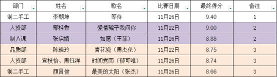 經(jīng)過兩場激烈的角逐,“永佳杯”歌唱比賽的最終排名終于揭曉!在萬眾期待中,制二手工線李朝坤憑借其醇厚動(dòng)人的嗓音和出色的舞臺(tái)表現(xiàn)力摘得桂冠,由常務(wù)副總黃總為其頒發(fā)了獎(jiǎng)狀及獎(jiǎng)金;人資部鄢桂香、制八課張啟娟獲得亞軍,由模具部部長馮文均為其頒發(fā)了獎(jiǎng)狀及獎(jiǎng)金;品質(zhì)部陳曉玲、人資部宣枝怡和周鈺洋、制二手工顏昌俊贏得了季軍的榮譽(yù),由財(cái)務(wù)部部部長張金平為其頒發(fā)了獎(jiǎng)狀及獎(jiǎng)金。